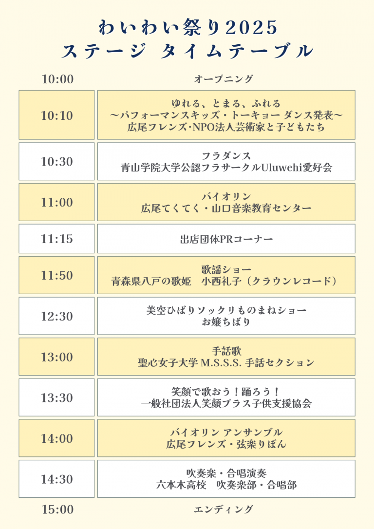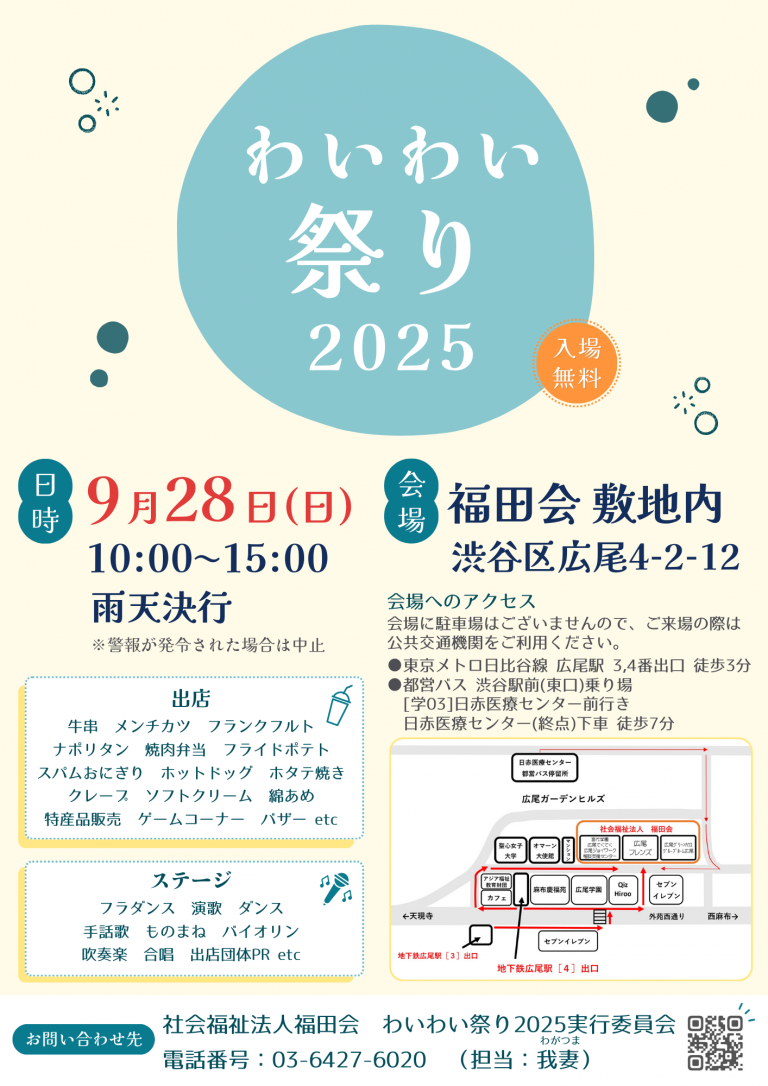 わいわい祭り fukudenkai 「わいわい祭り2025」を開催いたします!日時:2025年9月28日(日)10:00~15:00会場:社会福祉法人福田会 敷地内(渋谷区広尾4-2-12)雨天決行 入場無料会場に駐車場はございませんので、ご来場の際は公共交通機関をご利用ください。出店内容やステージ発表のタイムスケジュールは以下のチラシをご確認ください。皆様のご参加をお待ちしております。 チラシPDFはこちら